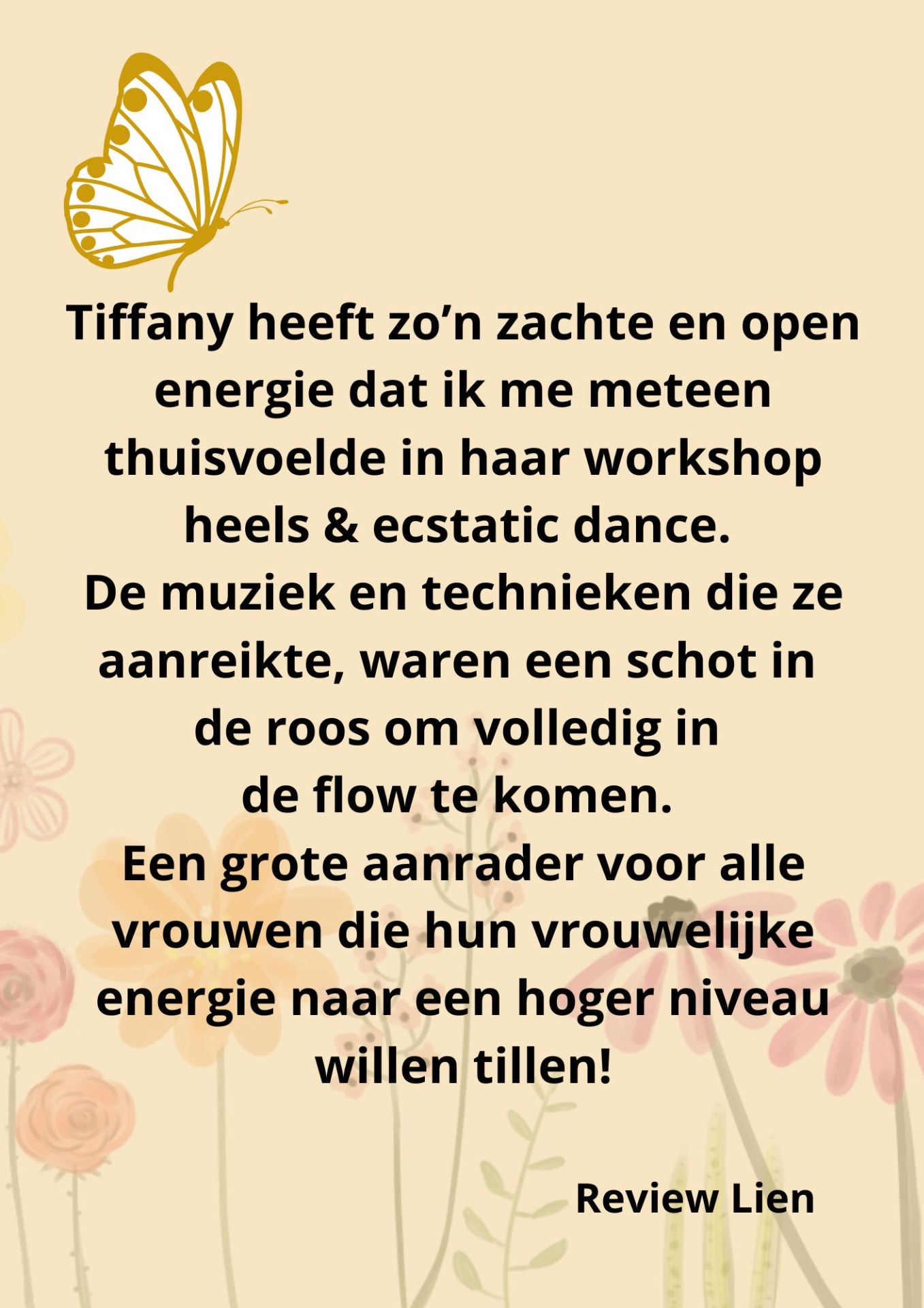 De meest krachtige ervaring die ik meeneem, is de herinnering aan de kracht van het bewegingsmedicijn. De lessen waren leerzaam vanwege de kennis die Tiffany deelt over de Godinnen, maar ook vanwege de belichaming ervan in de dans. Ik kan het zeker aanbevelen!