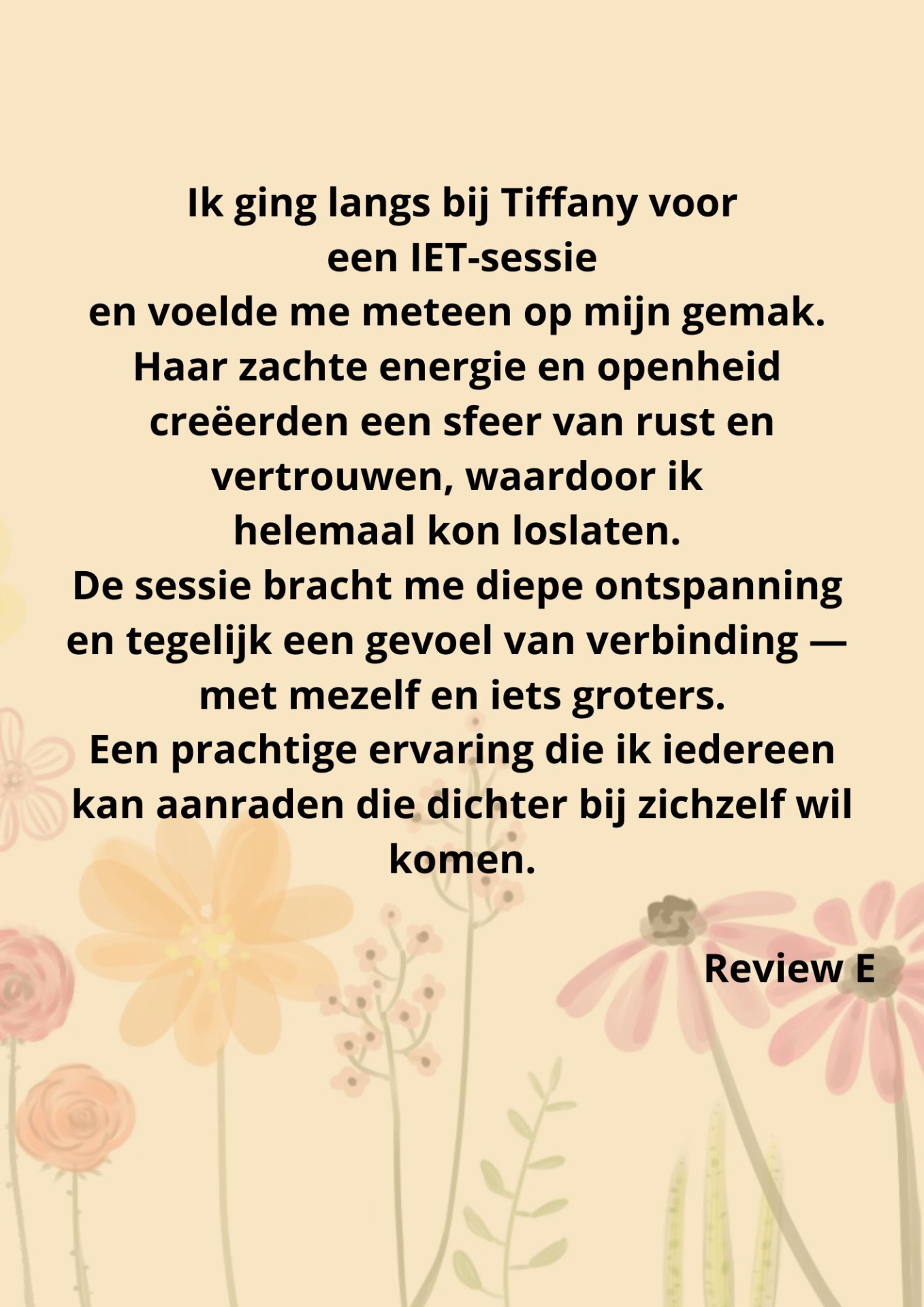Ik ging onlangs bij Tiffany langs voor een energetische healing IET. Meteen bij het binnenkomen voelde ik mezelf al zakken. Door haar zachtheid en openheid voel je je meteen op je gemak. De behandeling zelf was heel ontspannend. Ik ging de laatste weken door een moeilijkere periode en toen kon ik echt ontspannen en alles eens laten zakken. Zeker een aanrader! Ik ging heel onstpannen en met een klaarder hoofd terug naar huis. Topmadam!